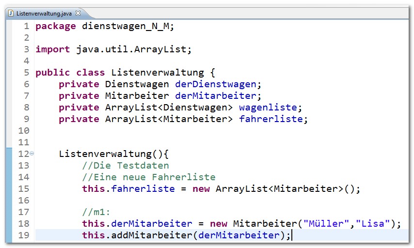Folge: Für den Fall, dass jeder Mitarbeiter prinzipiell jeden Dienstwagen nutzen kann, wird der Zusammenhang der Daten (die Listen) in einer Verwaltungsklasse (auch Managerklasse oder Steuerungsklasse) ausgelagert. Auflösung der N:M-Beziehung. Aus N:M wird 1:N und N:1.